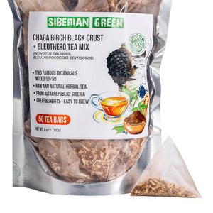 The Siberian Chaga Tea with Eleuthero root offers a natural way to boost energy and wellness. Now you can enjoy the potent combination of chaga mushroom tea with eleuthero root all in one tea bag. Originated from the clean Altai area of Siberia, this tea blend is rich in antioxidants, adaptogens and natural energizing elements to help you feel refreshed, focused and balanced throughout the day.