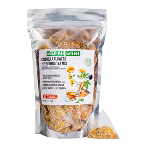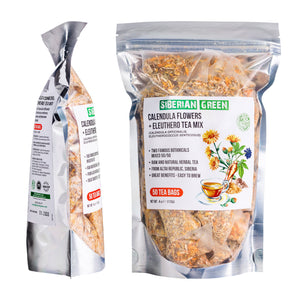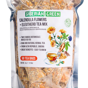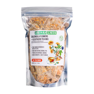 Unlock the benefits of nature with Siberian Green Eleuthero Root & Calendula Flower Tea, a premium blend crafted from wild-harvested herbs sourced directly from Siberia’s Altai Mountains the end product is expertly crafted and balanced herbal infusion. With half of it being powerful eleuthero root (Siberian ginseng) and the other half soothing calendula flowers, this tea serves as an herbal infusion capable of relaxing, boosting energy, supporting immune system, and offering many more benefits, all while being free of caffeine.